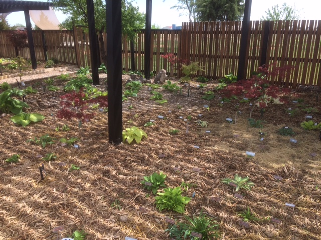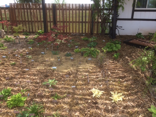 Jestem jednak wielbicielką i kolekcjonerem host i dobrze rozumiem pożądliwość serca kolekcjonera. Moja działka 12 lat temu była słoneczna patelnią bez jednego drzewa a ja chciałam uprawiać rośliny cienia!!! Jeśli się chce, można i brak naturalnego cienia pokonać. Sadziłam drzewa, aby się tego cienia w przyszłości dochować a tymczasem zastosowałam sztuczne cieniówki zawieszone na drewnianych stelażach. Takie konstrukcje wytrzymują zazwyczaj 5-6 lat i choć nie wygladają elegancko, pozwalają roślinom na prawidłowy rozwój.