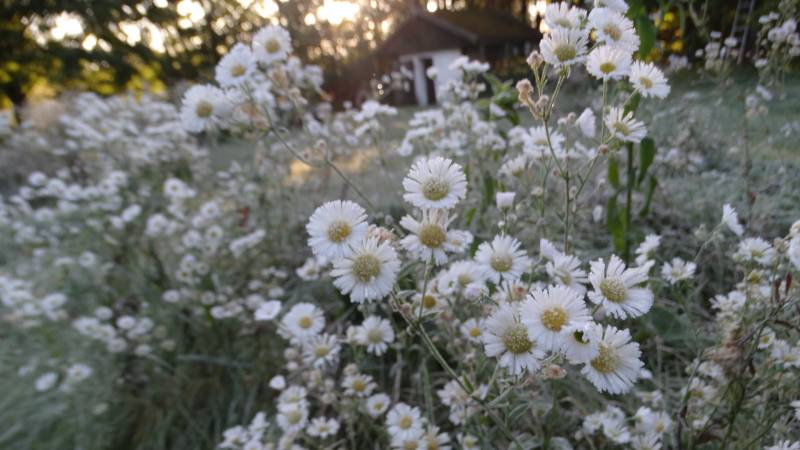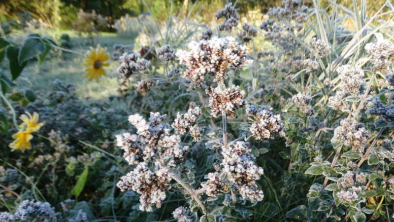 Gdy poranne słońce przebije się przez jesienną mgłę, ogród zamienia się w kryształowy pałac, gdzie rośliny mieniąc się w blasku przypominają oddech natury uwięziony w lodowych klejnotach. Oszronione gałązki, obwieszone lśniącymi kryształkami, zdają się pulsować światłem, a biel mgły oplata je jak delikatna zasłona, tworząc widowisko pełne magii i ciszy. Każdy liść staje się zwierciadłem, odbijającym promienie w tysiącu odcieni, jakby sam wiatr utkał z lodu koronę dla tej zimowej oazy.