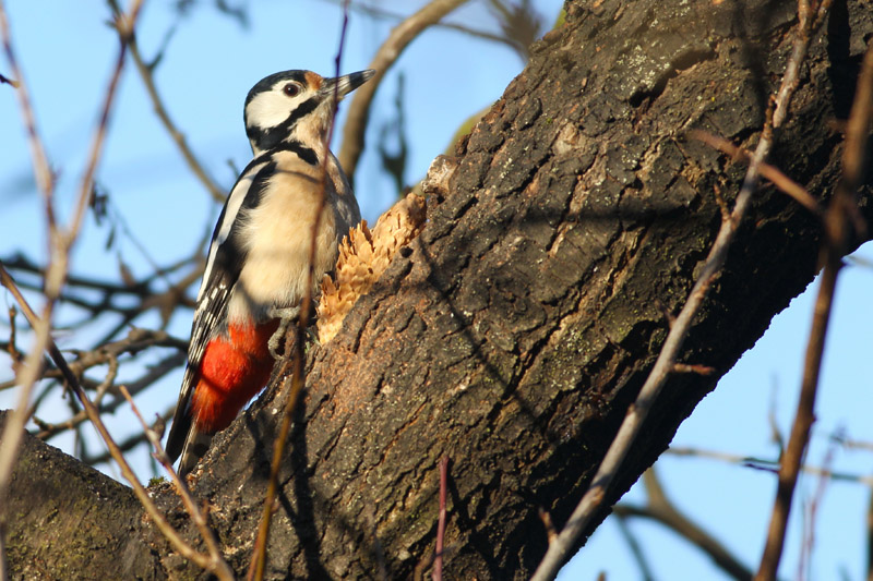 Już na stałe bywa u nas dzięcioł duży. Po pierwsze, bo ma kuźnię na naszej gruszy, po drugie, bo zawsze znajdzie coś pod korą naszych starych drzew owocowych.