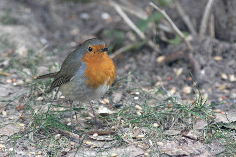 Zdjęcia z czatowni w altanie. Karmnik stoi tam, gdzie latem rosną dalie. Rudzik skusił się na słonecznik: