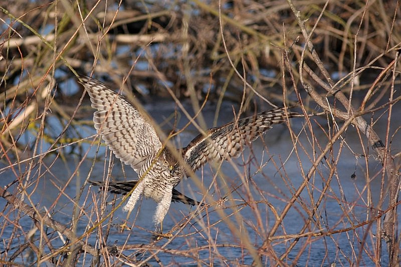W zimie zaglądał co jakiś czas do ogrodu. Ptaki korzystające z karmnika miały się gdzie schować w gęstych krzewach - łowy miał nieudane za każdym razem, ale wracał.