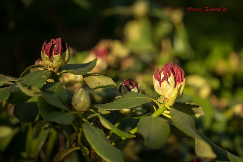 Właśnie rozpoczyna kwitnienie różanecznik o krwistoczerwonych kwiatach - 'Hachmann's Feuerschein'. W ubiegłym roku niemal nie kwitł z zasuszenia i zabiedzenia .Przeniesiony na inne miejsce, wygląda nieco lepiej i obficie zawiązał pąki. Walka o piękne liście nadal trwa.