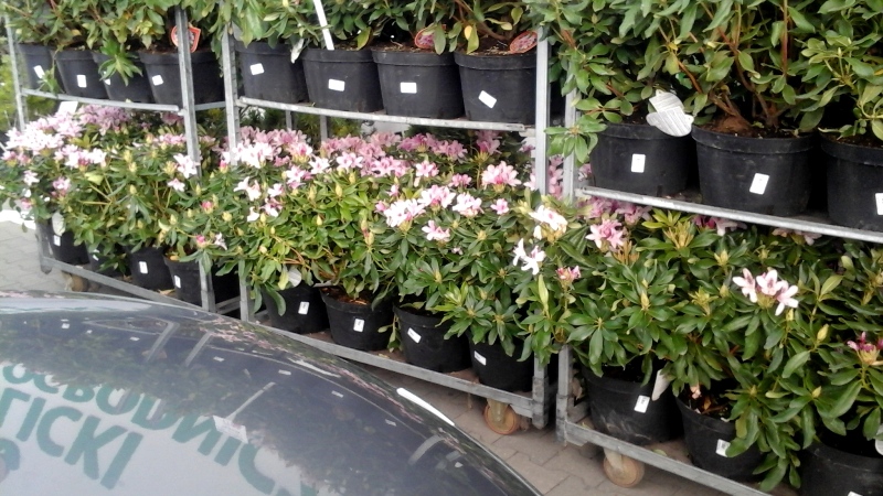 Całe półki zastawione były rododendronami a na reklamie był napis że, są to krzewy powtarzające kwitnienie.