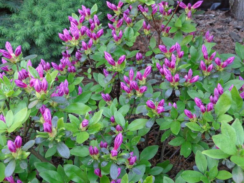 U mnie sezon kwitnienia rododendronów kończy różanecznik 'Paprika Spiced'. Przeniosłam go na osłonietą, ale mocno ciemną część ogrodu ze Sławojkowa, bo nie kwit łtam z powodu obmarzania pąków. Ma dość niską odporność na mrozy, bo -18C.W tym roku zakwitł, choć nie bardzo licznymi kwiatami.