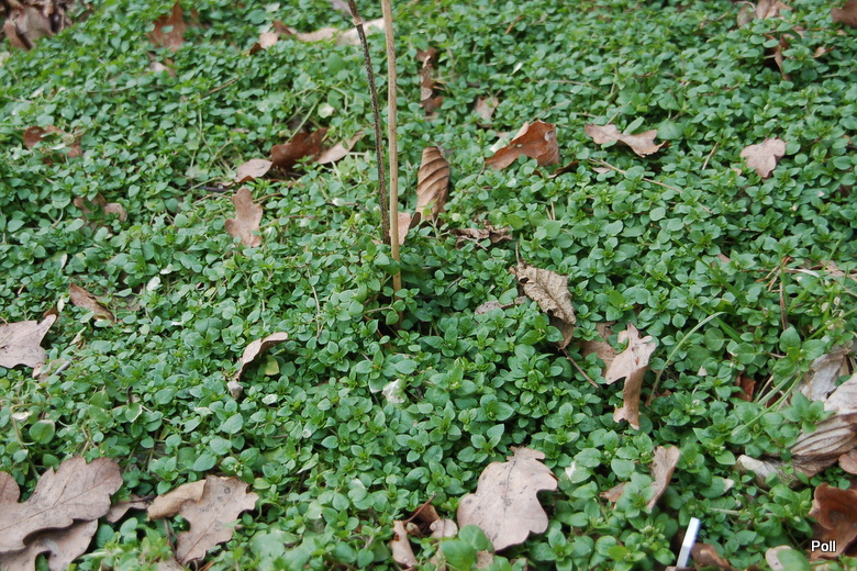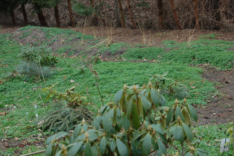 Gęsto porastająca glebę gwiazdnica pospolita wskazuje, iż gleba, na której rośnie jest bogata w próchnicę, czyli warta, by sadzić w niej rośliny. Tak jest w istocie. W ubiegłym roku postanowiłam zagospodarować tzw zielonkę, czy obniżony kawałek działki, który niegdyś był dnem stawu. Ziemia została przekopana, kłacza pokrzyw i żywokostów wyciągnięte ... Posadziłam rośliny jesienią, ale nie zdołałam wysypać korą całości młodych nasadzeń. Gdy po miesiącu nieobecności zawitałam do ogrodu, osłupiałam na widok gwiazdnicy tworzącej niemal zielony kożuch. Nie przeszkadzają jej przymrozki, nadal rośnie w siłę. Jest bardzo ciężka do wypielenia, bo ukorzenia się międzywęźlami i nie sposób wyrwać ją w całości - zawsze coś zostaje i szybko odbija. Jedny sposób, to po lekkim pieleniu, mocno wyściółkować (stosuję namoczone kartony a na nie korę)