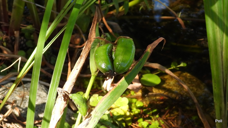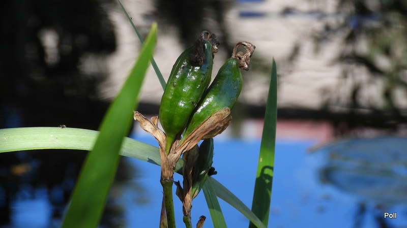 Jeżeli nie usuwamy przekwitniętych kwiatów w lipcu pojawiają się zielone pękate owoce-torebki wypełnione nasionami. Na jesieni pękają wysypując wiele dość dużych, brązowych, płaskich nasion. Liście są jasno zielone, mieczowate o długości około 70 cm i szerokości około 3 cm.