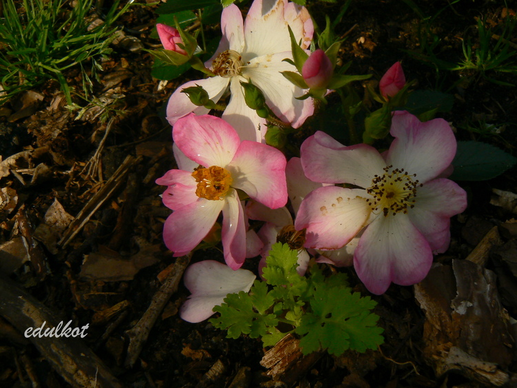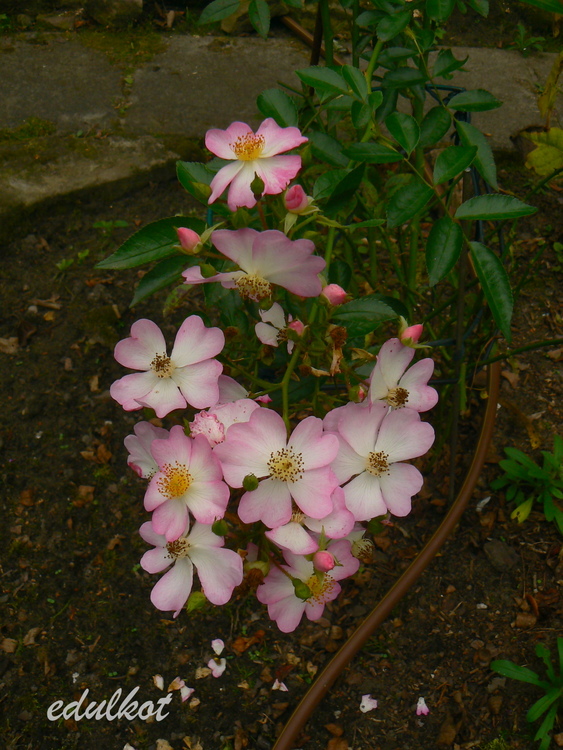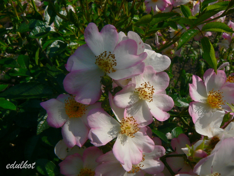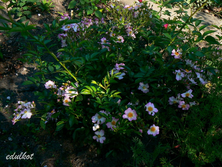 Kwiaty: małe, pojedyncze, jasnoróżowe z białym środkiem, żółte pręciki, kwitnie dużymi bukietami cały sezon,