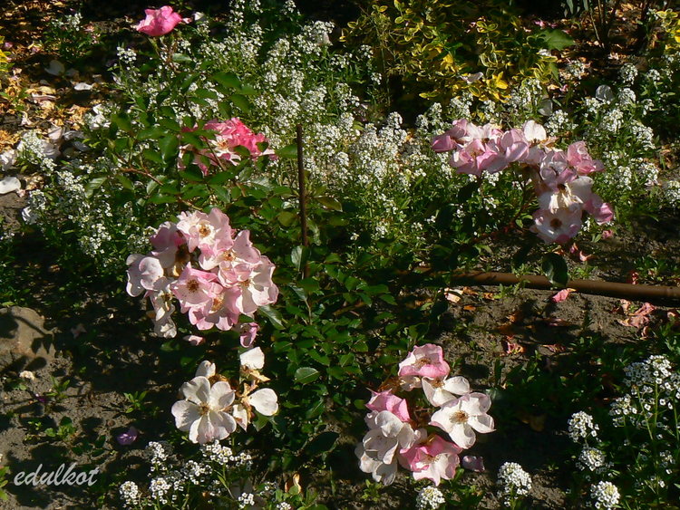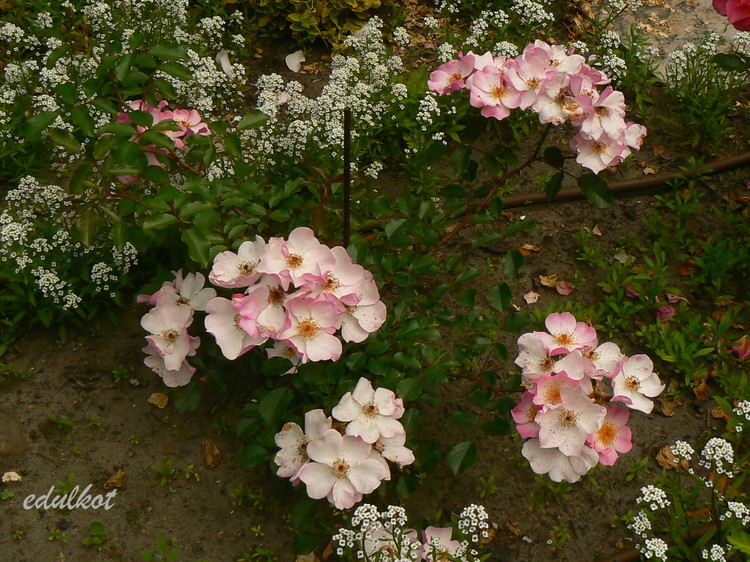 Kwiaty: małe i średnie, pojedyncze i półpełne, jasno różowe, biały środek, kwitnie w dużych gronach cały sezon.