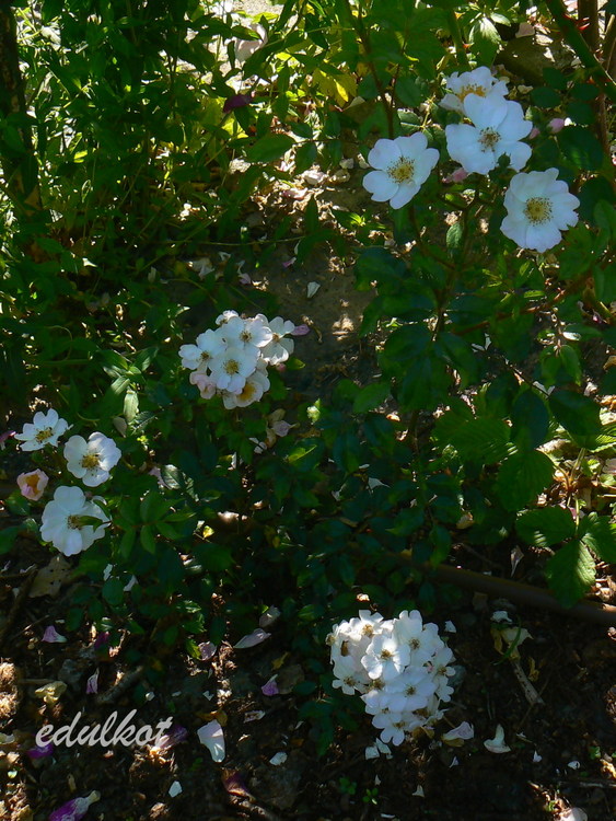 Swoją posadziłam w tyłach pnącej róży Kir Royal ale tak żeby potem wyższe pędy zaczepiać o dwa łuki wystawiając je na południowe słońce, bo podobno róża Dom dusz lubi słońce. Jak na razie ma bardzo cienkie i wiotkie pędy.