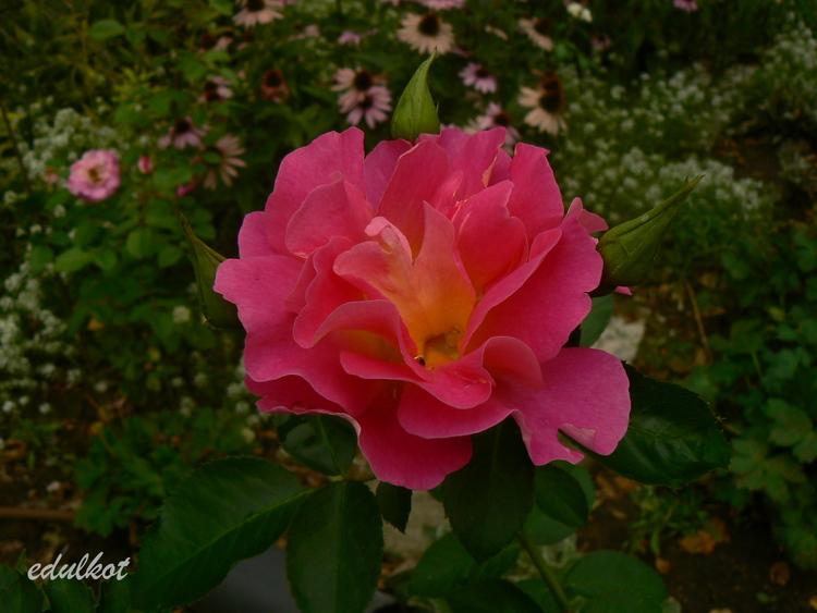 Hodowca: Łukasz Rojewski, Typ: rabatowa Kwiaty: Różowo-amarantowe z żółtym środkiem, półpełne, 8 cm, kwitnie w bukiecikach cały sezon Zapach Wielkość: wys. 0,9 m, szer. 0,6 m, Mrozoodporność: bardzo wysoka do 32 st., odporność na choroby wysoka