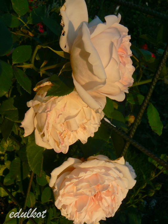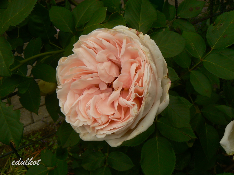 Kwiaty: różowo-morelowe, pełne, bardzo duże, 12 cm, w staromodnym stylu,