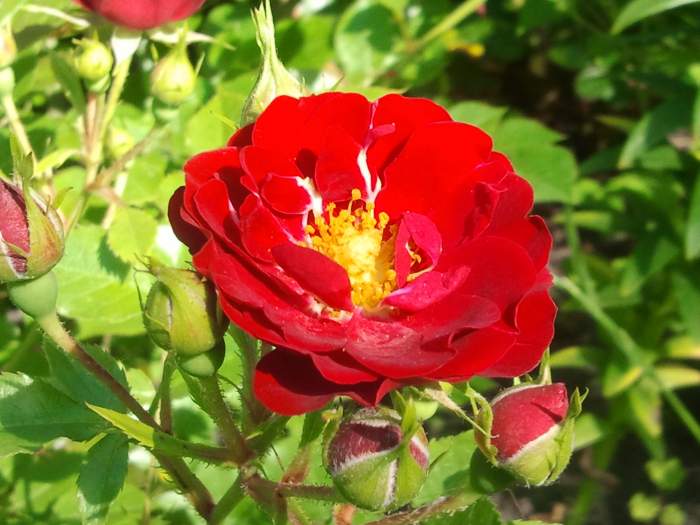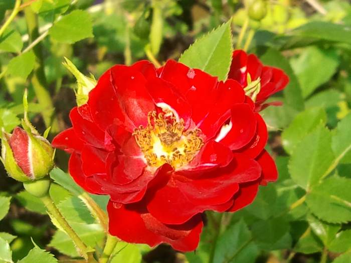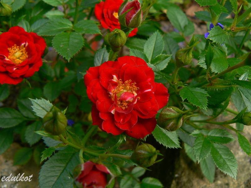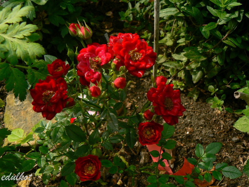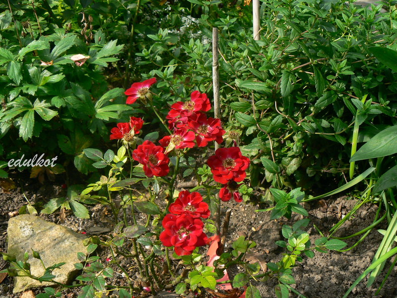 Drobne, krwistoczerwone kwiaty, lekko spłaszczone, wypełnione płatkami a jednocześnie ukazujące kontrastujący wianuszek żółtych pylników. Jasno zielone liście, zdrowe są dodatkową ozdobą.