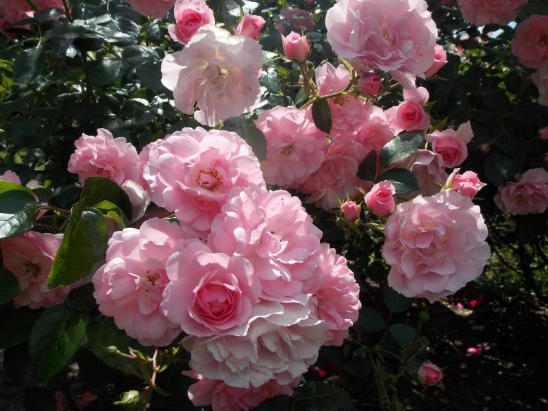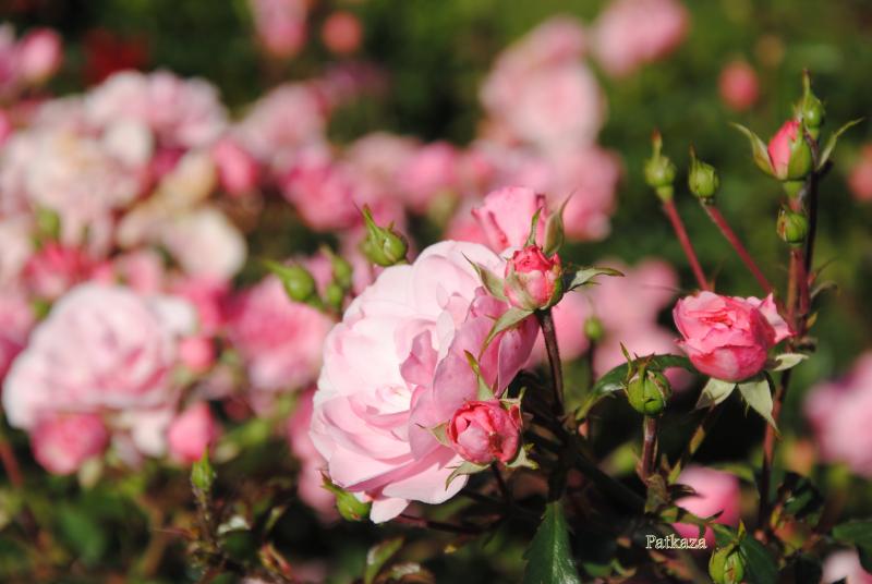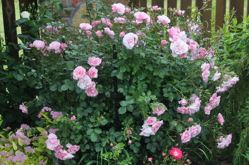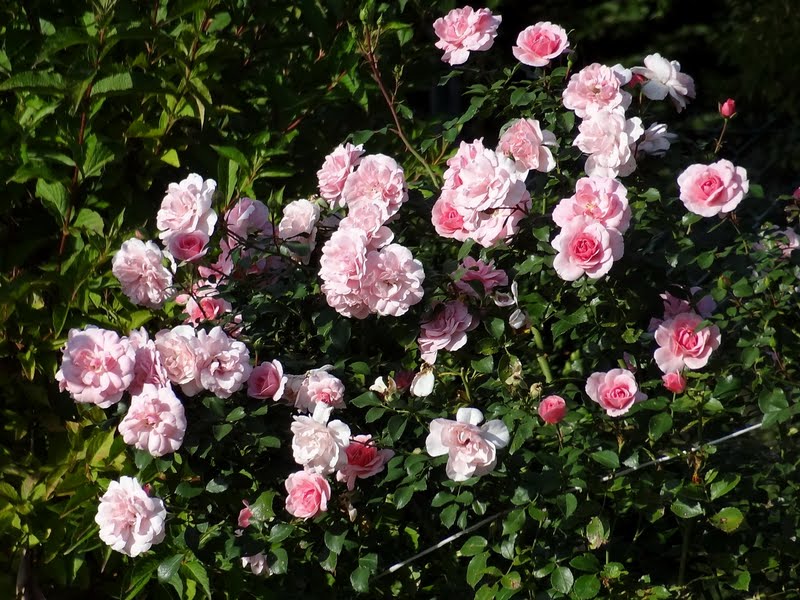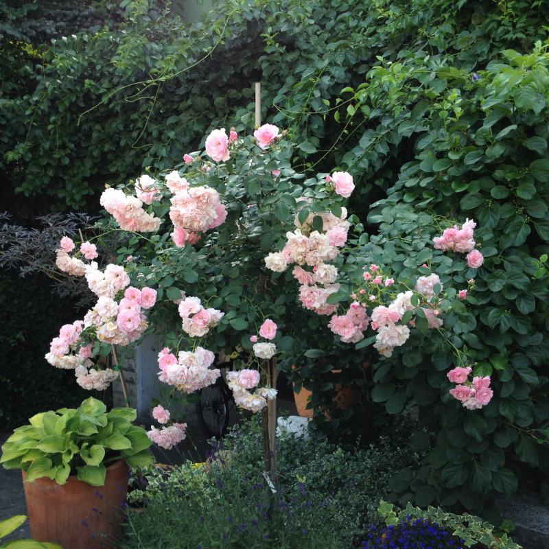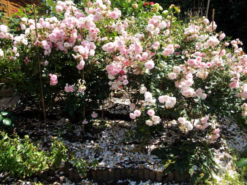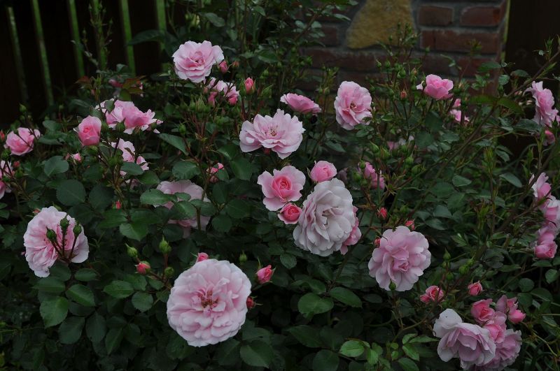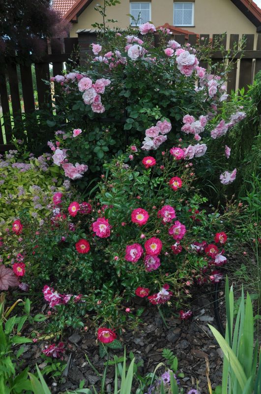 Bez wątpienia terminatorka. Mimo, że nie zaczęła kwitnąć jako jedna z pierwszych, kwiaty trzyma już cały miesiąc. Dwa krzewy trzymają się świetnie, nie chorują, doskonale się krzewią i kwitną. Dwa kolejne, posadzone w innym miejscu, mimo ADR-u zapadły na plamistość. Oberwałam im niemal 3/44 liści, te które teraz wypuszcza, są zdrowe. Sądzę, że sąsiedztwo chprpwitego Uncle Walter tak źle wpłynęło na te dwa krzaczki. Choroba nie spowodowała jednak, że kwiatów było mniej, a sam krzew kwitł gorzej. Ponieważ wiosną obcięłam ją tylko kosmatycznie, była naprawdę wysoka, bo dochodziła nawet do 1,5 m. i pedy mocno położyły sie. Wymagała więc podpory, co więcej - mogłaby nawet rosnąć przy niskiej pergoli. Uwielbiam tę różę w każdej fazie jej rozwoju, na początku kwitnie delikatnie, piekne , czyste jasnoróżowe kwiaty powoli się pokazują, by w krótkim czasie okryć cały krzew. Wtedy też całe kwiatostany rozwijają się , każdy kwiat z osobna rozkłada swe kwiaty. Długo utrzymują się na pędzie,a nim zostaną obcięte, nowe pędy już się budują.