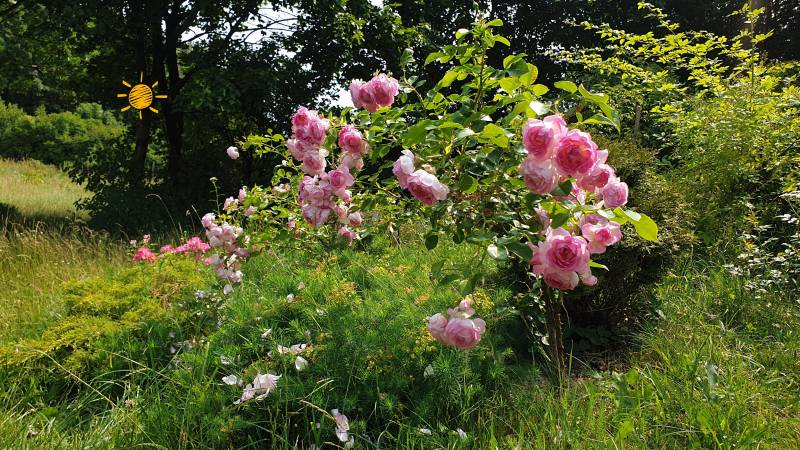 Róża Jasmina w zaprzyjaźnionym ogrodzie. Ilość kwiatów w tym roku oszałamiająca, a z róży wyrósł różany potwór flower