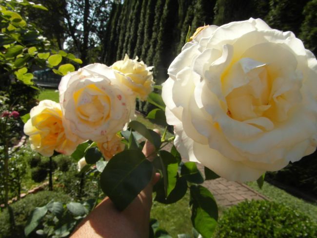 Polska odmiana o ogromnych, kremowo-maślanych kwiatach, w miarę przekwitania bielejących. Pięknie pachnie.