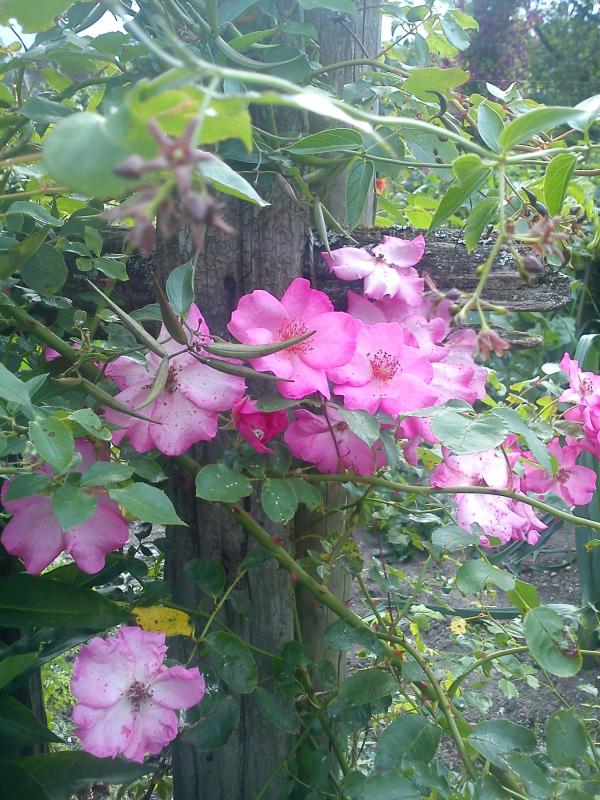 Strasznie trudno ją okiełznać. Pędy są jeżynopodobne, rzadko grubsze niż palec, bardzo giętkie i, jak wspomniałam, non stop rosną, wszerz i wzdłuż. Mają kolce zrywające skalp i szatę wierzchnią. Idealna podpora, jak mi się zdaje, powinna mieć kształt wachlarza. Moja róża rośnie przy płotku, tyle dobrego, że łatwo się ją owija wokół listew.