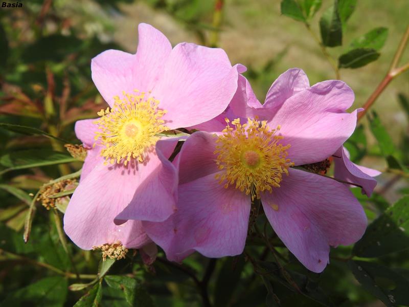 Kwiaty różowe, pojedyncze, pachnące. Pylniki żółte, dobrze widoczne, chętnie obsiadane przez pszczoły.