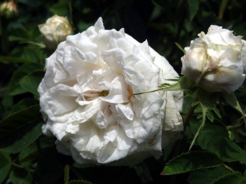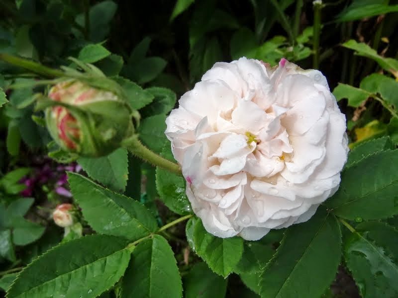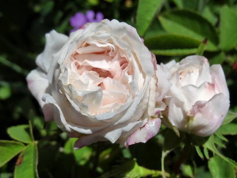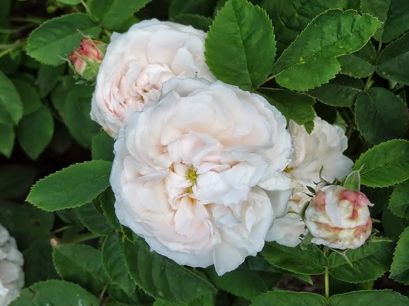 Kwiaty białe z odcieniem różu. Bardzo pełne o budowie ćwierćrozetowej średnicy ok. 8 cm. Pachnie bardzo mocno.
