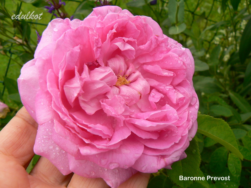 Kwiaty: różowe z liliowym odcieniem, duże o średnicy 15 cm, pełne (26-40 płatkó), płaskie rozetowe z tzw. button eye.