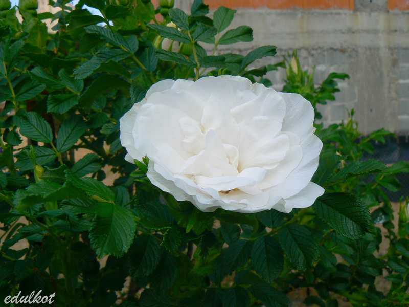 Kwiaty: dość duże (8 cm), półpełne białe (9-16 płatków) z widocznymi pręcikami, długie, spiczaste pąki, kwitnie obficie i powtarza kwitnienie.