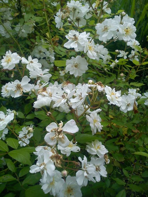 Kwiaty białe, półpełne, w wiechach. Kwitnie praktycznie w ciągu całego sezonu.
