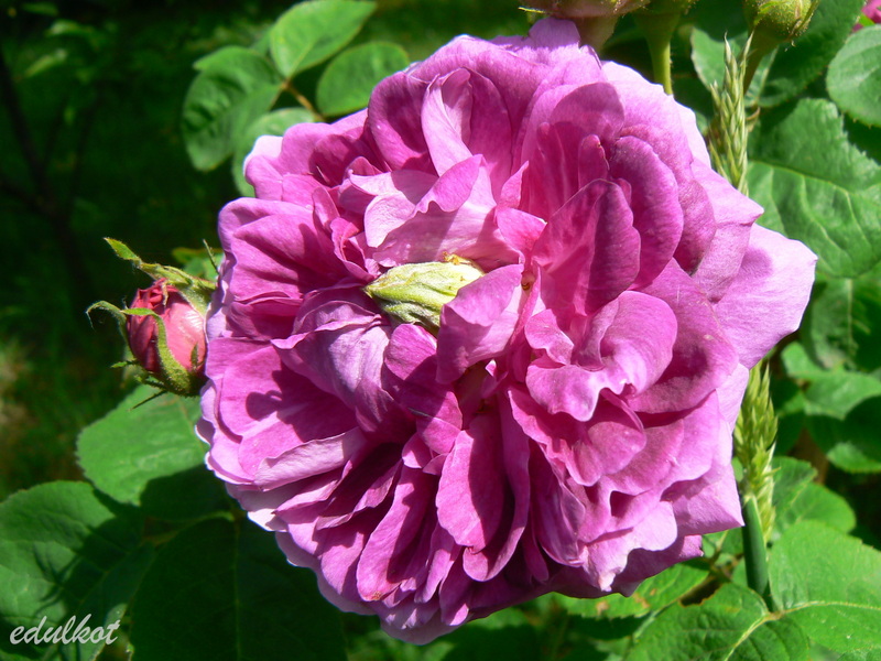 Kwiaty: ciemno-różowe do fioletowych, średnie ok. 6-7 cm, pełne (25-40 płatków), rozetowe, w pełnym rozkwicie pokazują zielone oczko, kwitnie tylko raz.