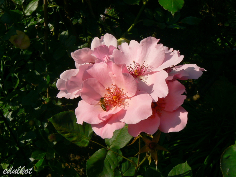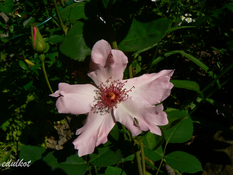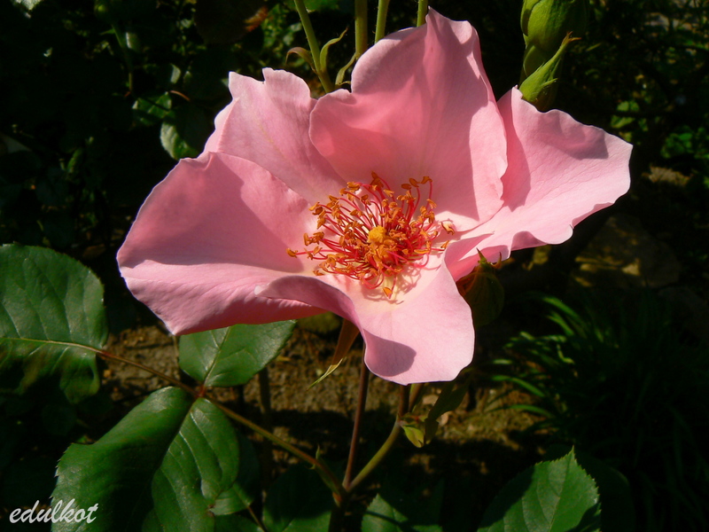 Kwiaty: różowołososiowe, średnie, ok. 9 cm, pojedyncze (4-8 płatków), płaskie, odsłaniają pylniki w rdzawoczerwonym kolorze, powtarza kwitnienie,