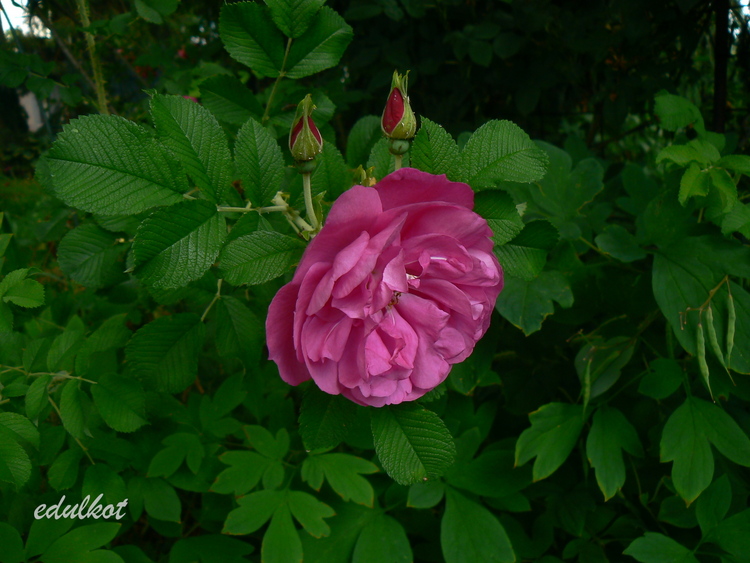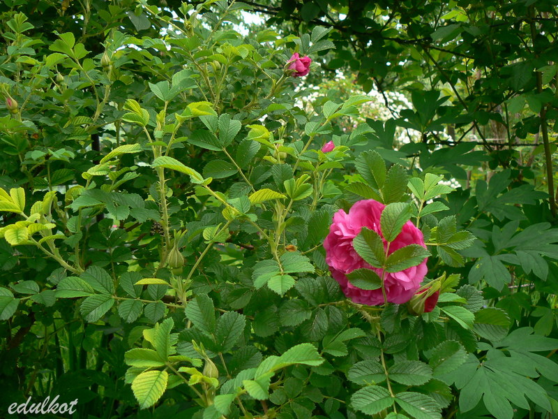 Kwiaty: ciemnoróżowe, średnie średnica ok. 7 cm, półpełne (17-25 płatków), rozkwitając pokazują żółte pręciki, obficie kwitnienie wiosną i latem, ale ciągle pojawiają się na niej jakieś bukieciki.