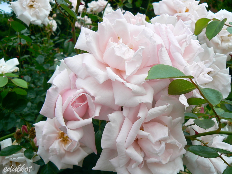 Kwiaty: duże średnica 10 cm, półpełne (17-25 płatków), jasnoróżowe do bieli, kwitnie raz,