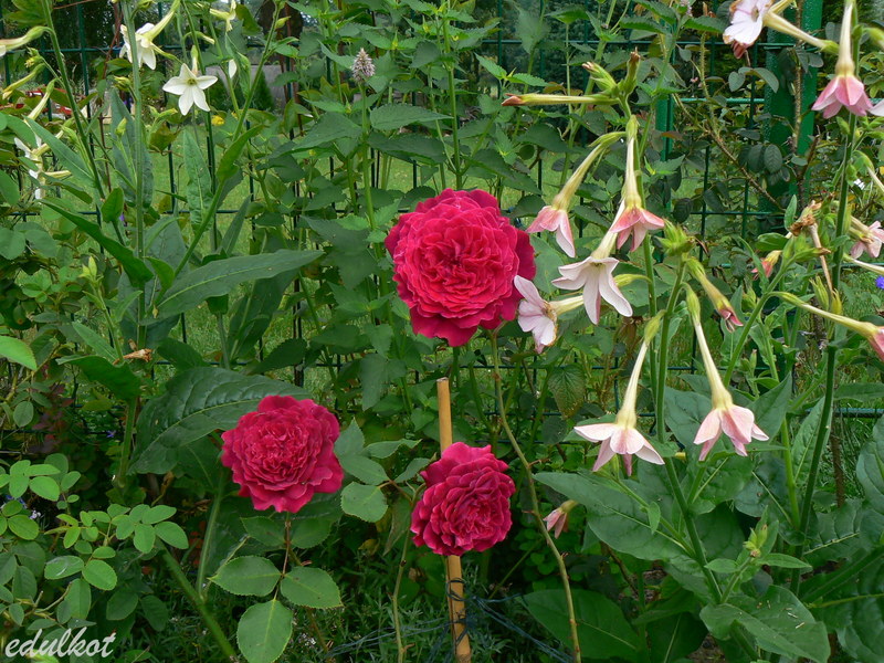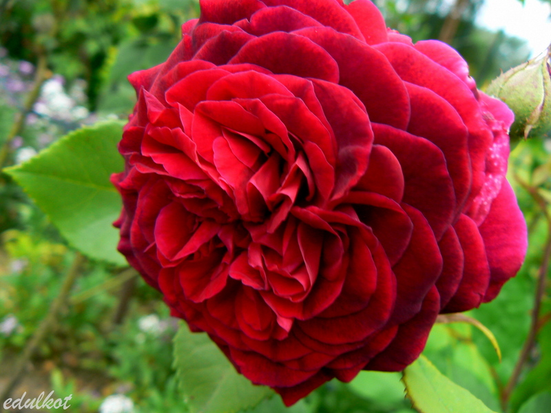 Kwiaty: ciemnoczerwone do purpurowych, ćwierć-rozetowe, duże średnicy 10 cm, pełne (ok. 50 płatkó), słabo powtarza,