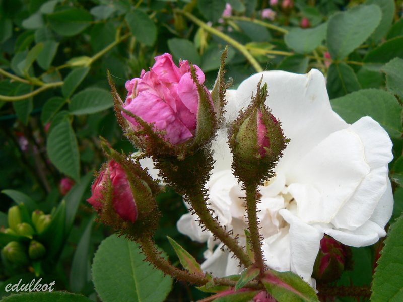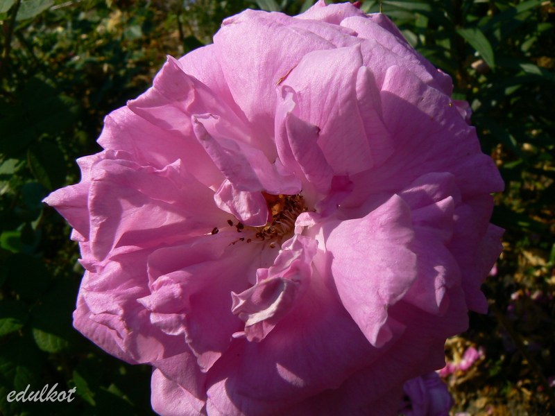Kwiaty: duże, ćwierćrozetowe, pełne (do 50 płatków), różowe do karminowo różowych, w przekwicie przechodzą w fioletowe, rewersy mlecznoróżowe, lub wiśniowo-purpurowe, kwitnie raz,
