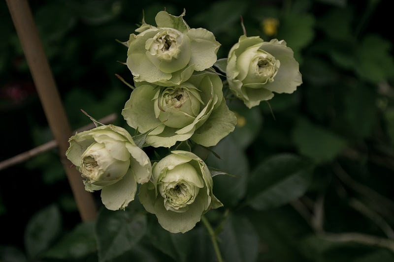 Róża o nietypowym biało-seledynowym wybarwieniu kwiatów.