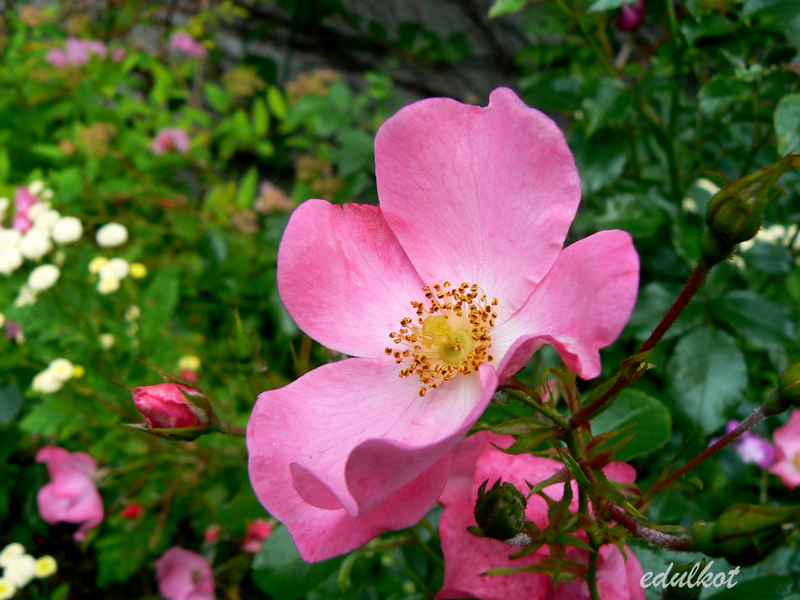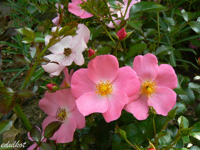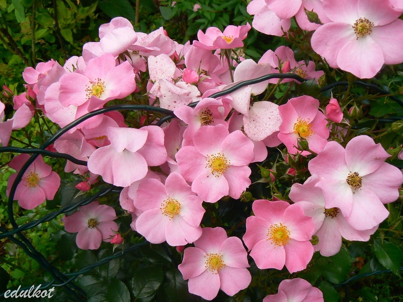Kwiaty: małe średnica ok. 3-4 cm, pojedyncze (4-8 płatków), łososiowo-różowe z jaśniejszym centrum, kwitnie dużymi bukietami cały sezon,