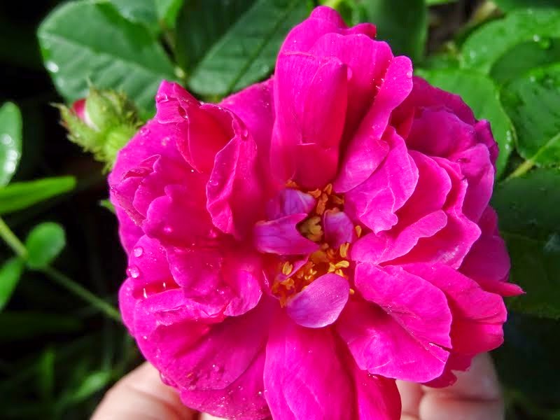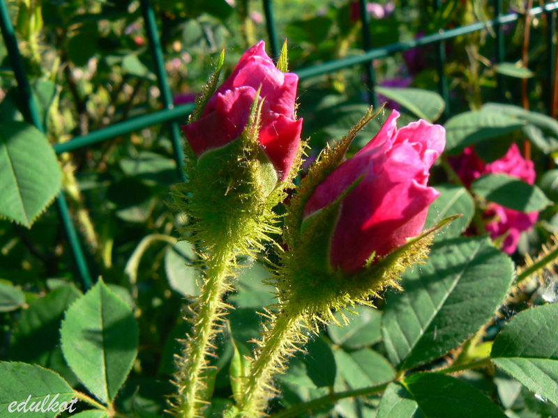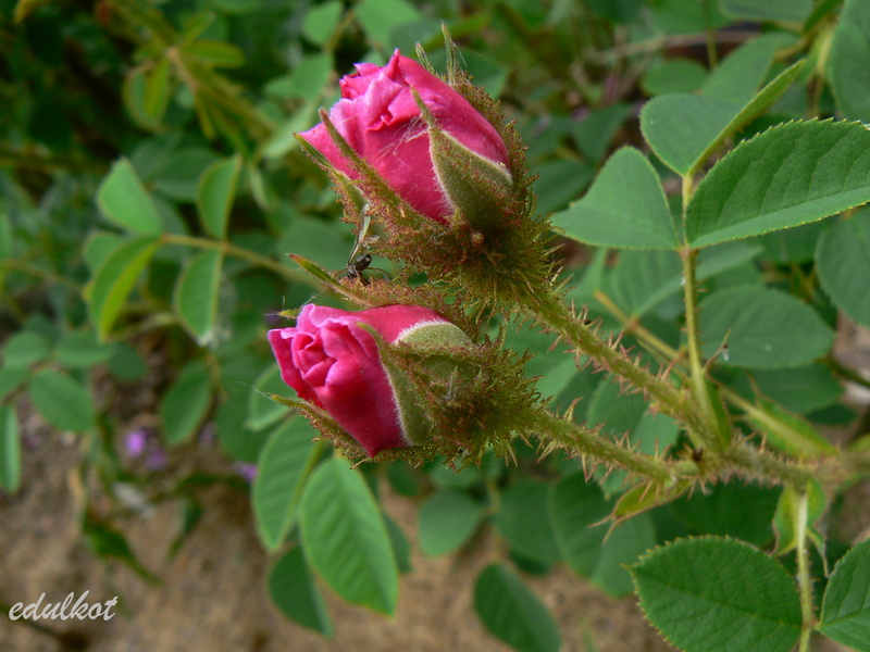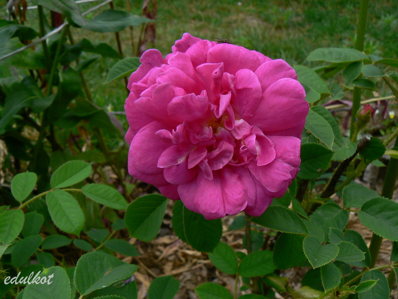 Kwiaty: średnie ok. 6-7,5 cm, półpełne, ciemno różowe poprzez liliowe do czerwonych, w rozkwicie pokazuje żółte pręciki, pąki okryte zielonym mchem, kwitnie raz choć podobno czasami powtarza, zawiązuje owoce,