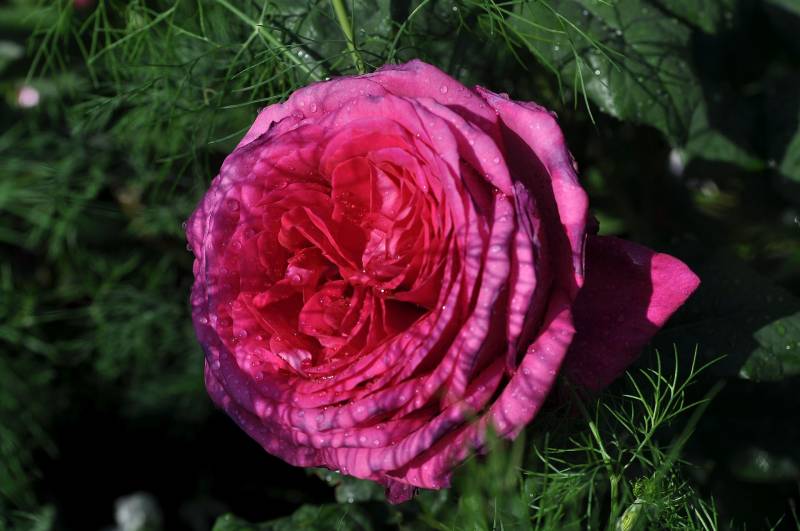 Kwiaty: ciemno czerwone z lekką tendencją do wpadania w odcienie fioletowe w rozkwicie, ogromne ok. 14-15 cm, bardzo pełne (40-100 płatków), kwitnie bukietami kilka razy w sezonie,
