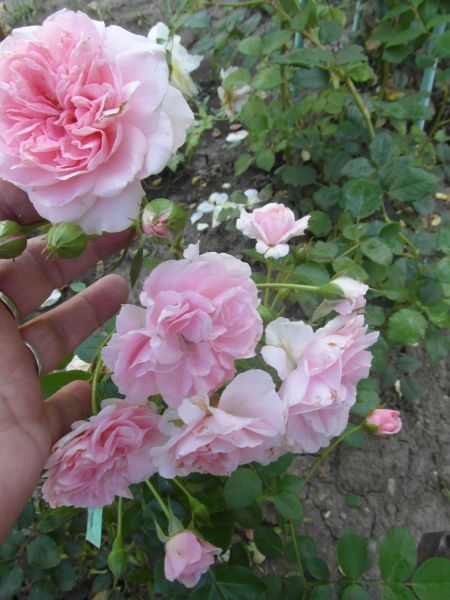 Kwiaty: różowe, średnie ok. 6-8 cm, bardzo pełne (75-85 płatków), rozetowe, staromodne, kwitnie bukietami cały sezon, delikatne płatki brzydko wyglądają podczas deszczu,