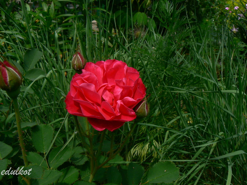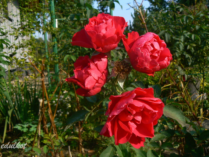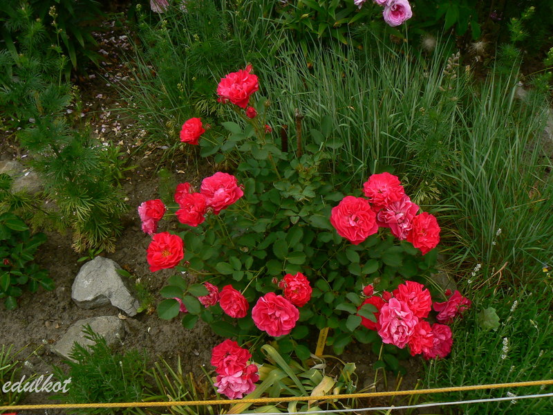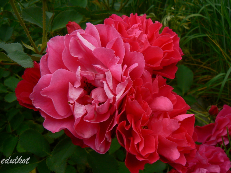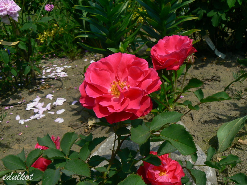 Kwiaty: karminowo-różowe, średnie ok. 6-7 cm, pojedyncze i półpełne (16-25 płatków), kwitnie bukiecikami całe lato, sporadycznie powtarza,