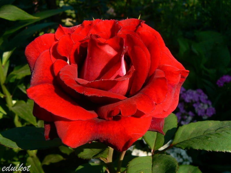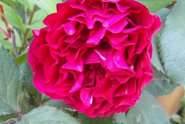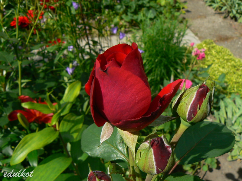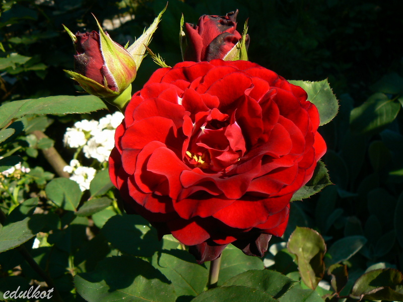 Kwiaty: ciemnoczerwone, średnie ok. 8-10 cm, pełne (40-60 płatków), po kilka w klastrze, długo utrzymują się na krzewie, kwitnie kilkakrotnie w sezonie, w ostrym słońcu się przypala,