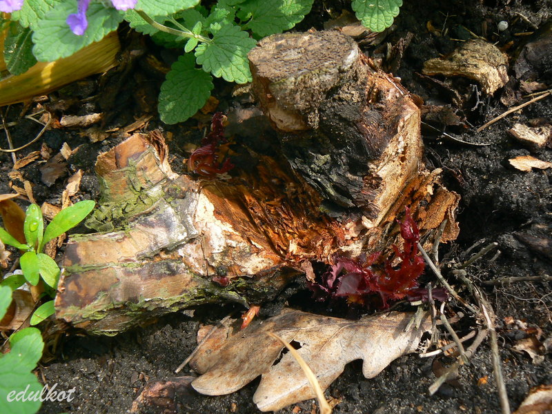 Jedna Sympathie długo nie wykazywała oznak życia, ścięłam ją do gruntu i chciałam wyciąć siekierą te suche, grube resztki. No nie dałam rady i poddałam się, mówię - jak minie jakiś czas to może same spróchnieją i łatwiej pójdzie karczowanie. Oto co zobaczyłam parę dni temu zdziwko