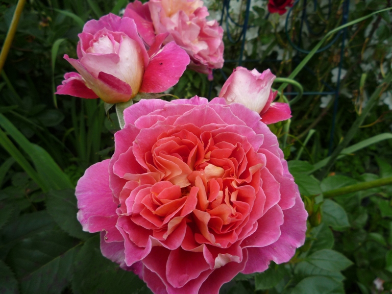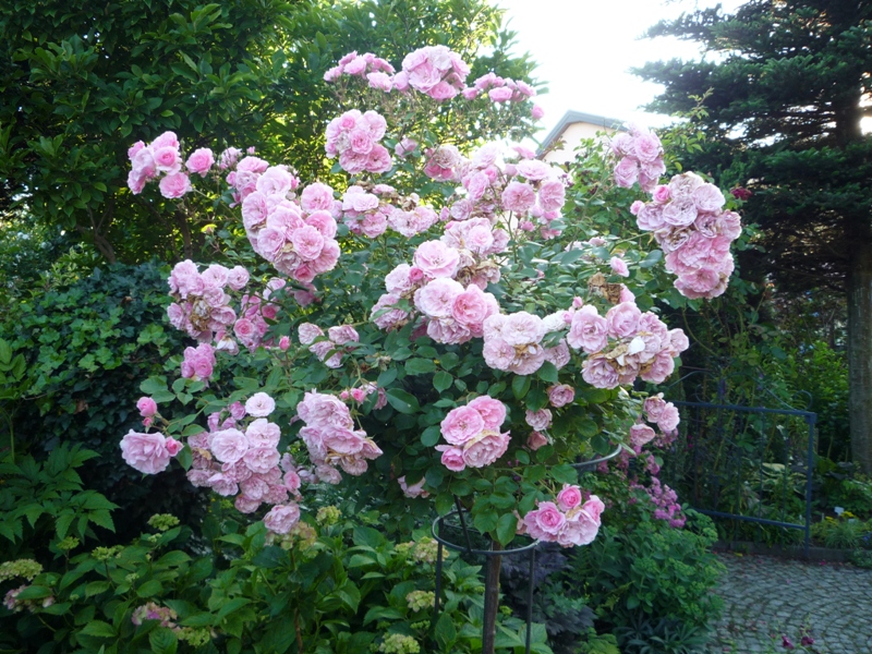 W oddali widać "doktorka" rośnie w lekkim cieniu a na pierwszej linii przy ścieżce rośnie róża pienna Brian.