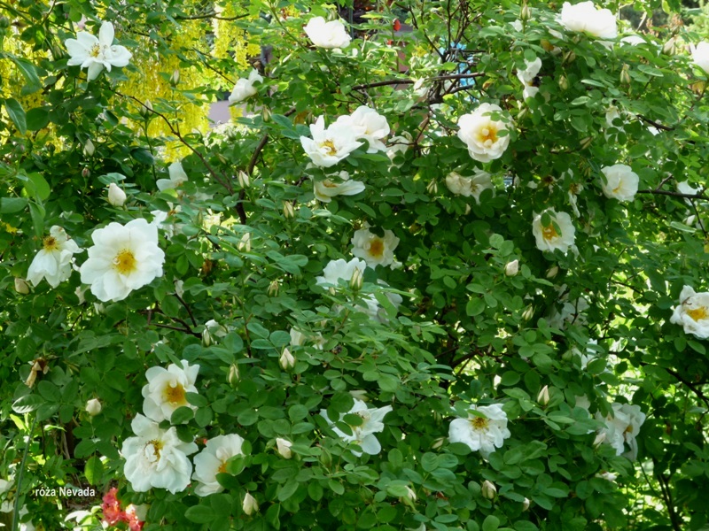 I jeszcze róża Nevada piękna o dużych białych kwiatach z żółtymi pręcikami cały krzew obsypany bielą wygląda bajecznie .