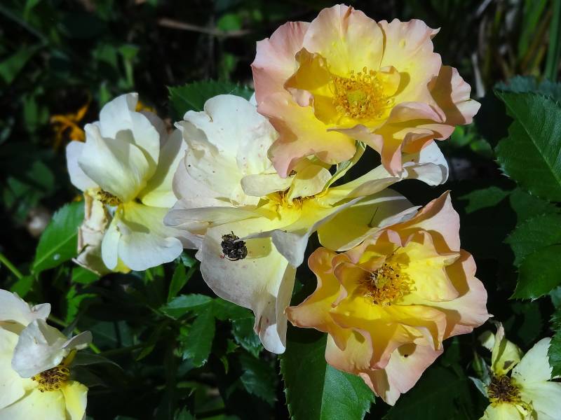 Wspomnienie z czerwca - wyjątkowo wcześnie i niezwykle obficie zakwitły czerwcowe róże. Na zdjęciu widać kwitnącą Marię Curie, Bonicę ( ta przekwita dopiero teraz, a więc po miesiącu), Candelight ( która znów obsypana jest pączkami) i śladowo Dauble Delight.