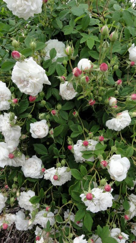 Kwiaty pąki malinowe, kwiaty białe, średnie, bardzo pełne, kwitnie raz