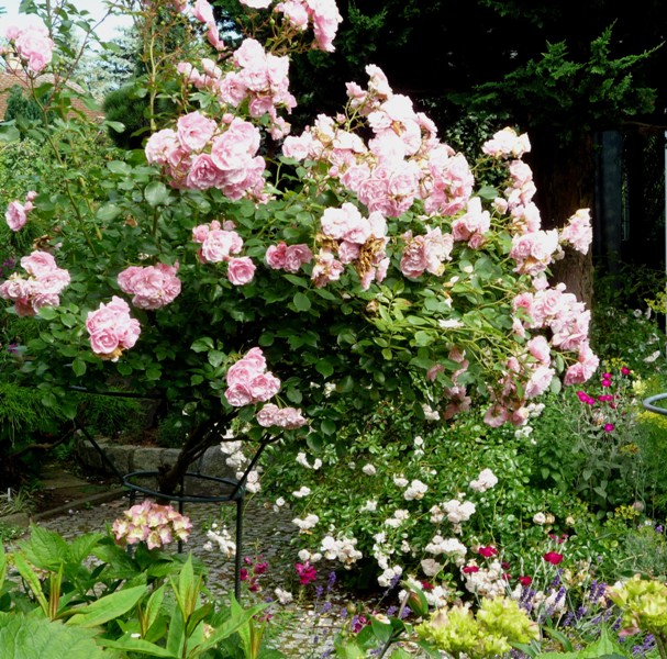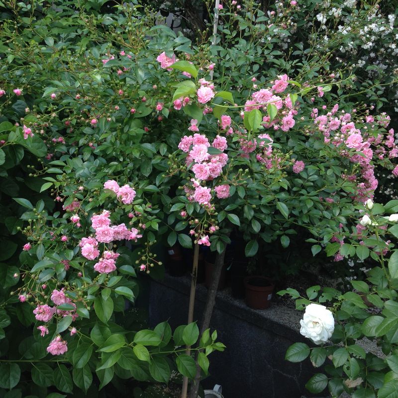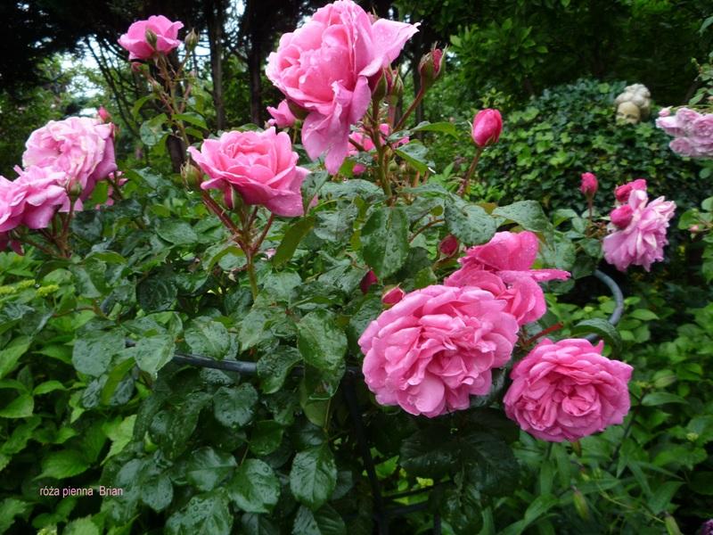 Inną róża pienną, która rośnie między różami Bonica jest róża Brion