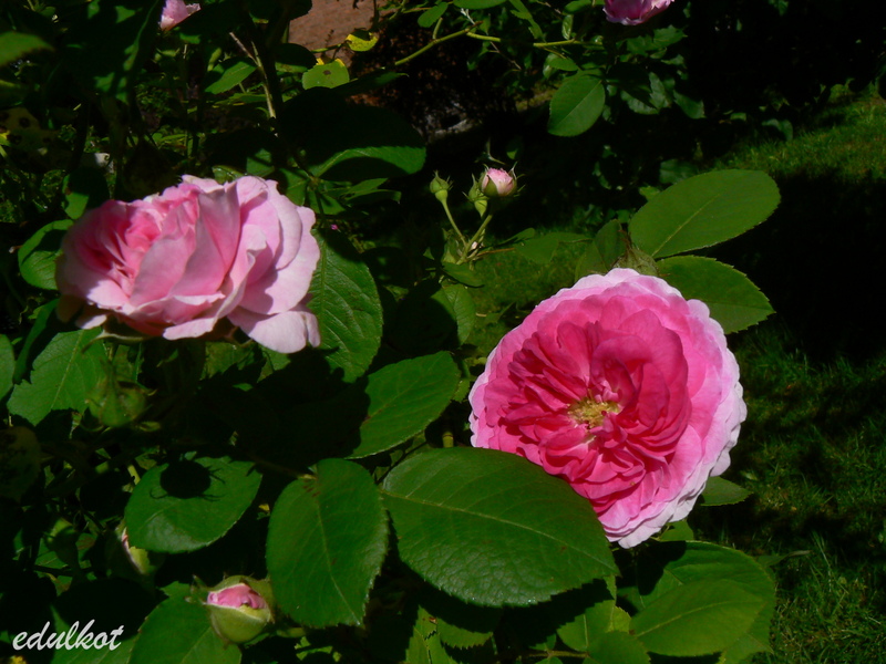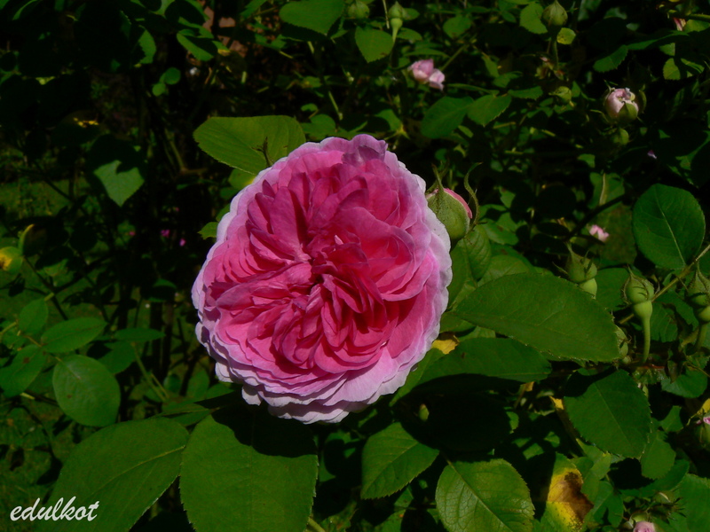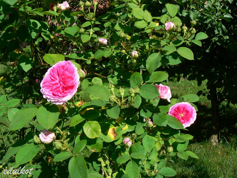 Kwiaty: karminowo-różowe jaśniejące w miarę rozkwitu, centrum ciemniejsze, średnie, pełne, ćwierć-rozetowe, pół-koliste do płaskich, kwitnie tylko raz;