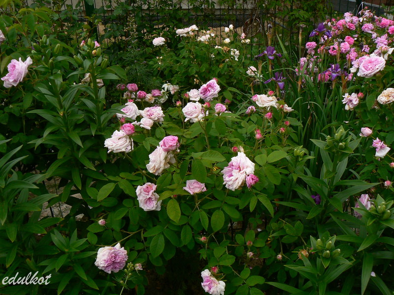 Kwiaty: duże, bardzo pełne, ćwierćrozetowe, fioletowo-różowego do karminowych z jaśniejszą krawędzią, bardzo zmienne, ta róża jest artystą metamorfozy, może przybierać różne formy, kwitnie raz;