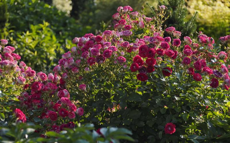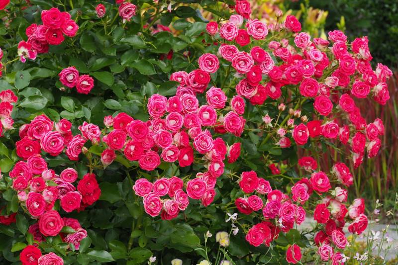 Kwiaty: Drobne średnicy 4-5 cm, pełne czerwono-białe zebrane po kilkanaście w kwiatostanie.