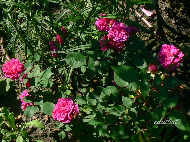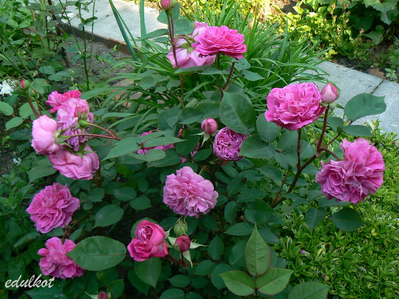 Kwiaty: średnie 5-6 cm, pełne (26-40 płatków), rozetowe, karminowo-czerwone, kwitnie cały sezon;