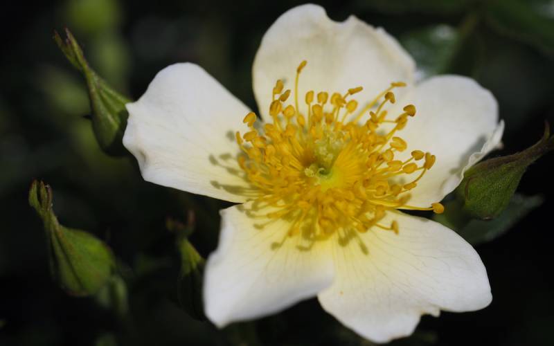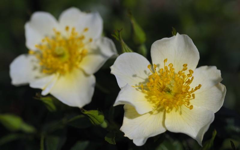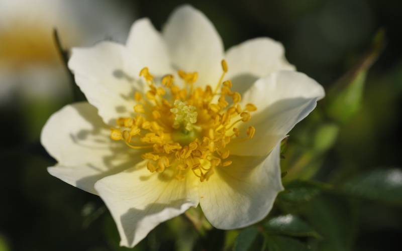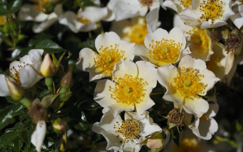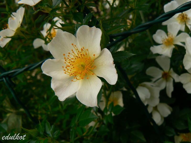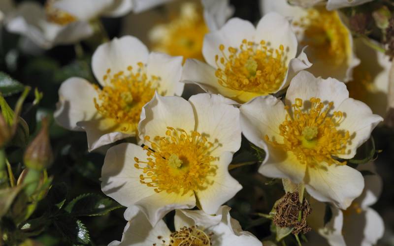 Kwiaty: małe 3 cm, pięciopłatkowe, białe, żółte pręciki, kwitnie bukiecikami cały sezon;