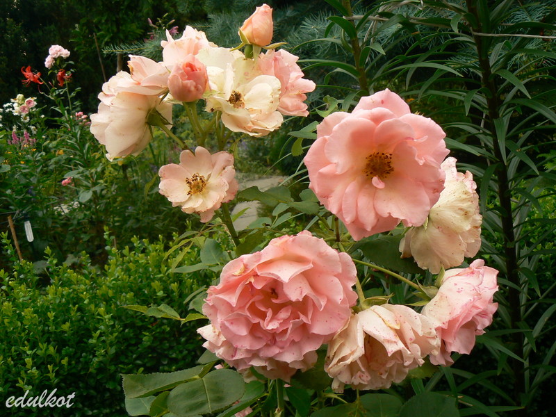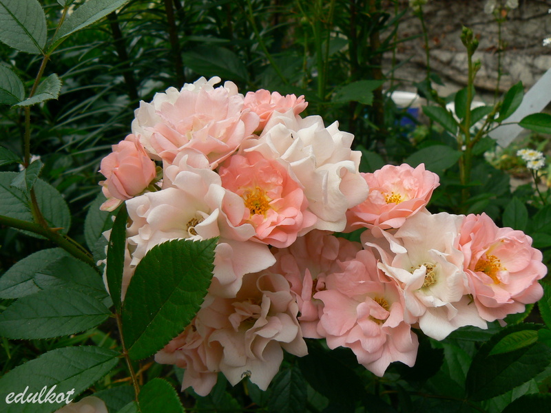 Kwiaty: duże 9 cm do średnich, półpełne, miseczkowate do płaskich w rozkwicie, różowo-łososiowe do jasno-różowych, kwitnie wiechami cały sezon;